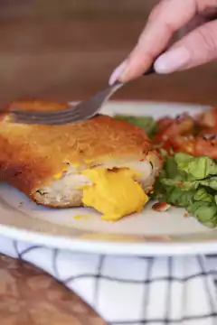 Estas deliciosas milanesas están hechas con pechuga de pollo y rellenas de un exquisito queso cheddar y panceta.